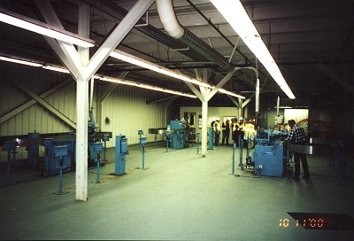 Crown Pacifics filing supervisor Larry Averett (center in white hardhat) explains the recent improvements that have been added include a double length infeed twin band and 6" (150 mm) curve sawing edger.