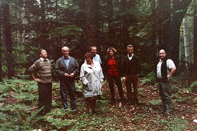 Left to Right: Vincent Colineau, Luc Batard, Brigitte Batard, Christian Cheveaux, Bernadette Cheveaux, Christian Nicolas, Philippe Siat stopped to stand among the tall trees just outside the blast zone of Mount St. Helens. The height and girth of the old growth trees was a constant source of awe.