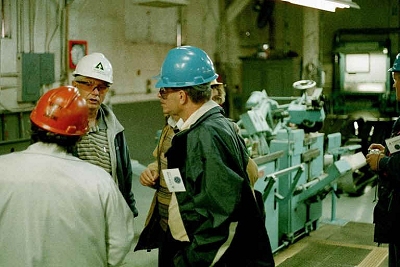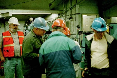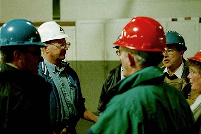 John Gammelgaard, Filing Supervisor at Weyerhaeusers Cascade Lumber in Enumclaw, Washington, explains their "reliable process" philosophy to Vincent Colineau and Brigitte Batard.