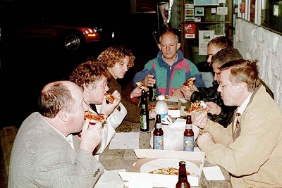 No restaurants were open by the time we emerged from the dense fog in Mt. Rainier National Park, so a late dinner of pizza, beer, fruit and chocolate was improvised just before this gas station/convenience store closed. The operators kindly left the light on for us when they left for the night.